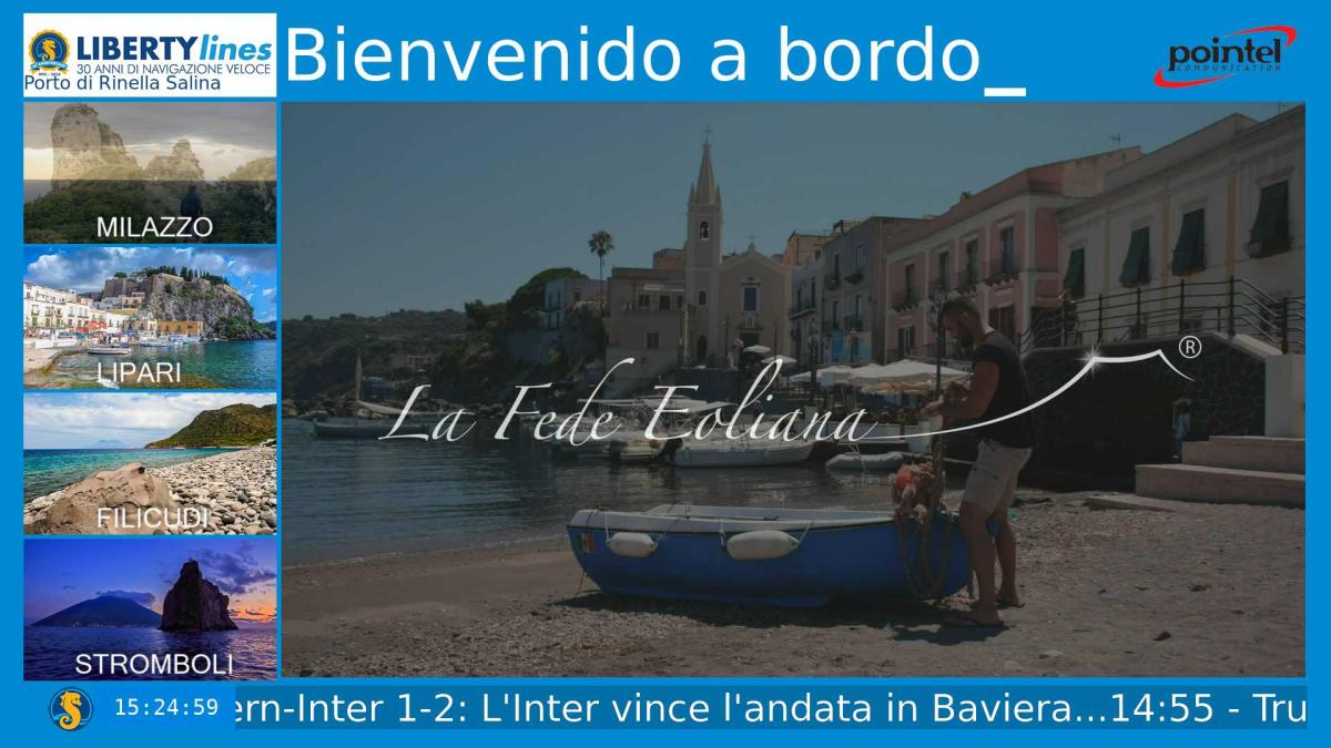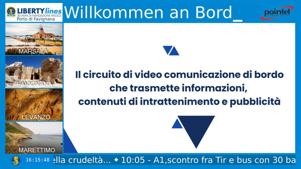 Loghi delle compagnie Liberty Lines e Pointel Communication Spa, sempre visibili in sovraimpressione, per rafforzare il branding e la partnership.